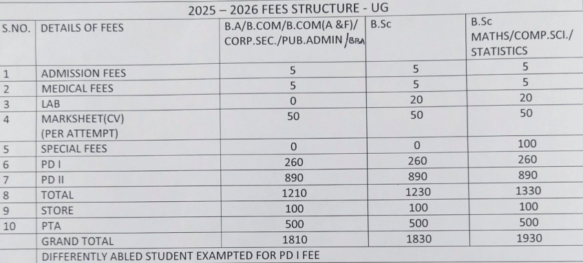 Nandhanam Arts College, as a government institution, offers annual fees around 2000 INR, with free tuition for students from SC/ST quotas due to government scholarships.