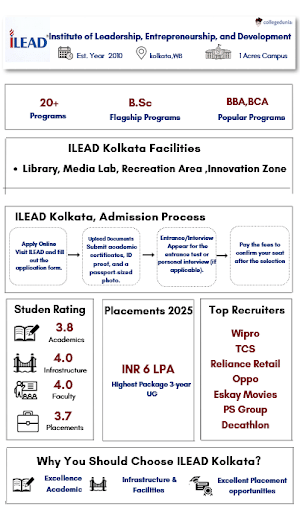 Institute of Leadership, Entrepreneurship, and Development (ILEAD), Kolkata was established in 2010. It is a private higher education institution affiliated with Maulana Abul Kalam Azad University of Technology (MAKAUT). It is approved by the UGC. Since its inception, ILEAD has focused on academic programs in media, design, management, and applied sciences. ILEAD Kolkata offers undergraduate and postgraduate programs in media, design, management, technology, and applied sciences.