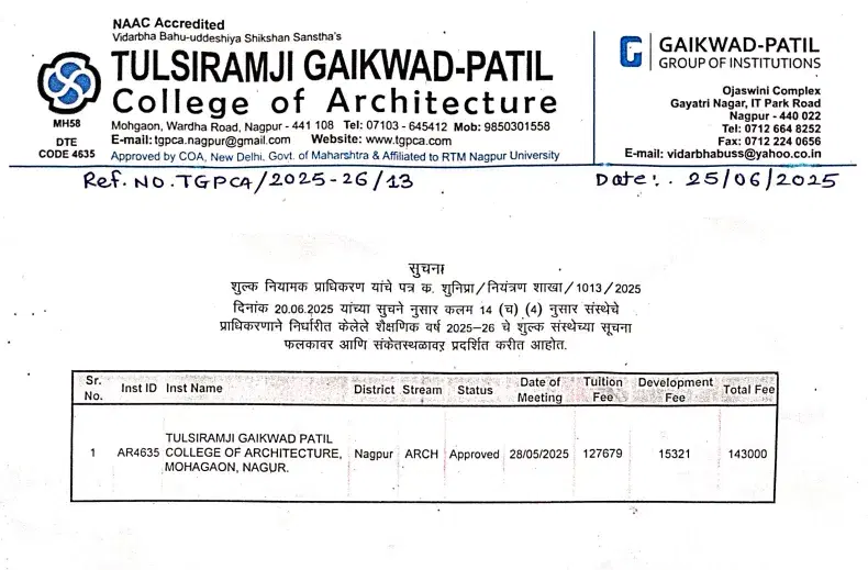 Tulsiramji GaikwadPatil College of Architecture Nagpur B.Arch is offered as 5 Years Full Time program, with total intake of 40 seats. The minimum eligibility criteria for B.Arch is 10+2 with NATA. The total fees for Tulsiramji GaikwadPatil College of Architecture Nagpur B.Arch in 2025 is ₹ 7.15 Lakhs for the complete course duration, which includes total tuition fees of ₹ 6.38 Lakhs. Earlier, the fees in 2024 - 2025 for B.Arch was ₹ 7.36 Lakhs.