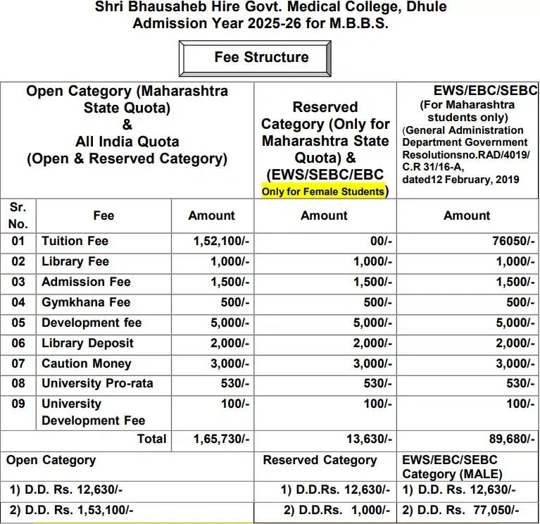 Earlier, MBBS fees at Shree Bhausaheb Hire Government Medical College & Hospital Dhule was ₹ 6.91 Lakhs (in 2023) for the entire course duration. This shows a fee increase of ₹ 1.1 Lakhs over the year.