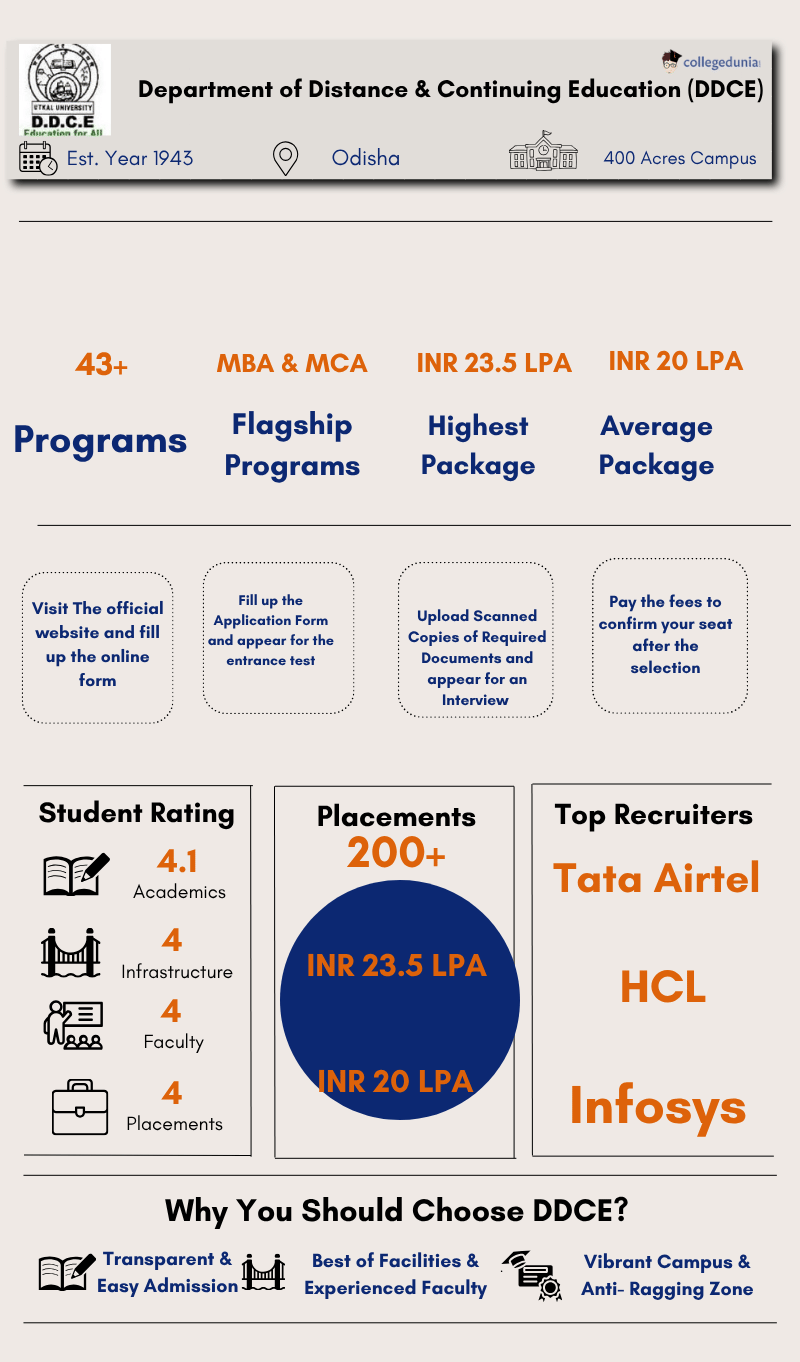 - Admission Criteria: DDCE offers admission into the MCA course on the basis of an Online Entrance Test conducted by Utkal University, followed by a Personal Interview.