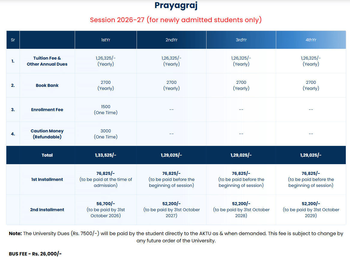 Earlier, B.Tech Data Science fees at UGI Allahabad was ₹ 5.65 Lakhs (in 2025) for the entire course duration. This shows a fee increase of ₹ 67,500 over the year.