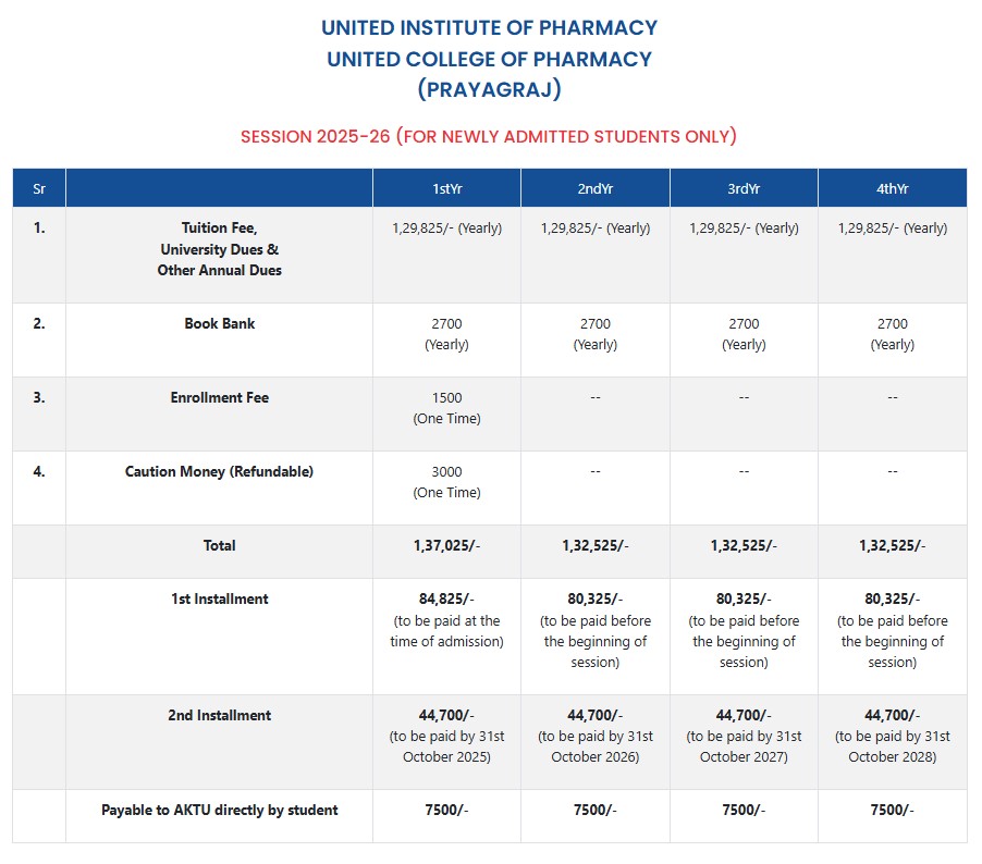 Earlier, B.Pharma {Lateral} fees at UGI Allahabad was ₹ 3.93 Lakhs (in 2024) for the entire course duration. This shows a fee increase of ₹ 31,500 over the year.