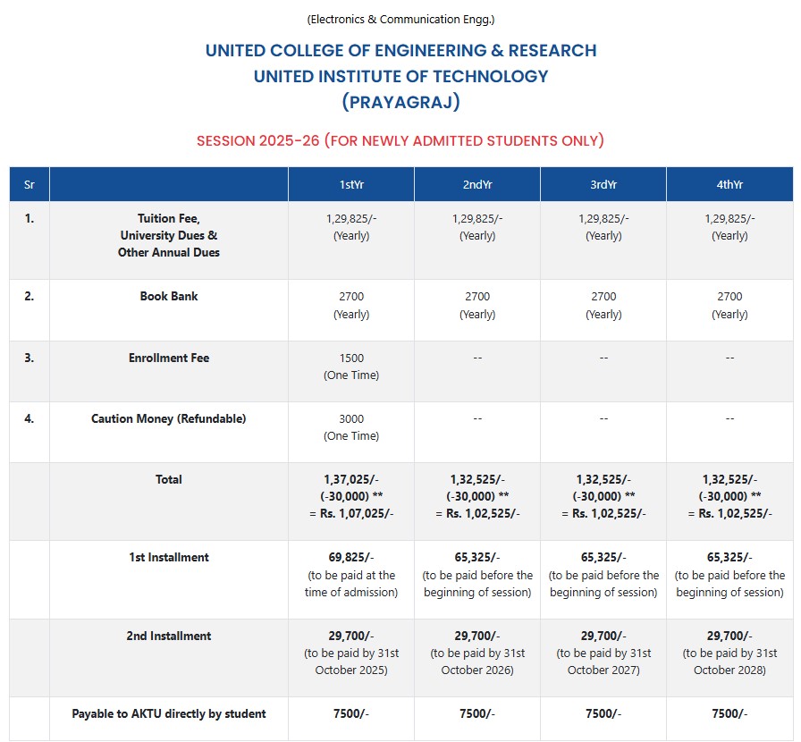 Earlier, B.Tech Electronics & Communication Engineering fees at UGI Allahabad was ₹ 4.59 Lakhs (in 2023) for the entire course duration. This shows a fee increase of ₹ 1.06 Lakhs over the year.