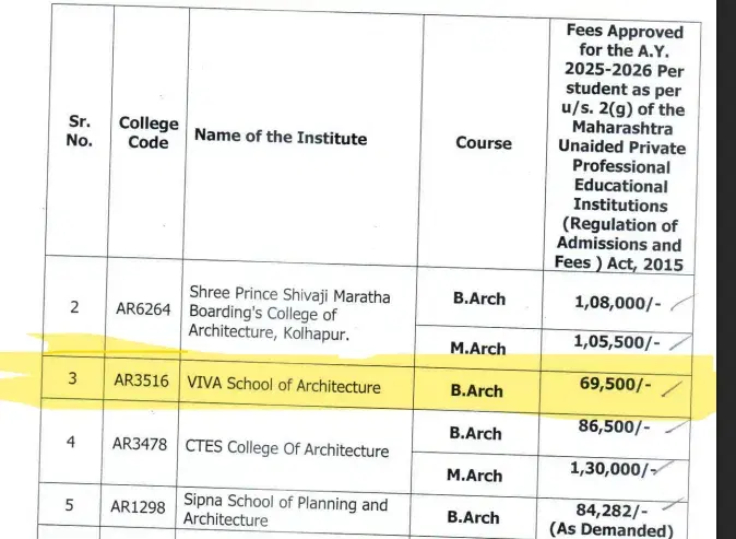 Viva School of Architecture Palghar B.Arch is offered as 5 Years Full Time program, with total intake of 40 seats. The minimum eligibility criteria for B.Arch is 10+2 with 45% + NATA. The total fees for Viva School of Architecture Palghar B.Arch in 2025 is ₹ 3.48 Lakhs for the complete course duration, which includes total tuition fees of ₹ 3.48 Lakhs. Earlier, the fees in 2024 - 2025 for B.Arch was ₹ 4.3 Lakhs.