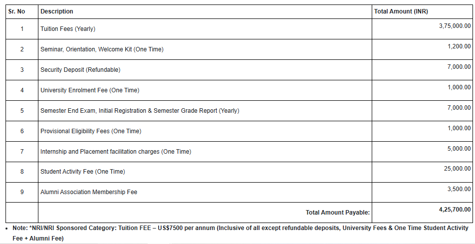 - From Year 2 onwards, annual payable amount = Tuition Fee (INR 3,75,000) + Semester Exam/Registration Fee (INR 7,000) = INR 3,82,000 per year.