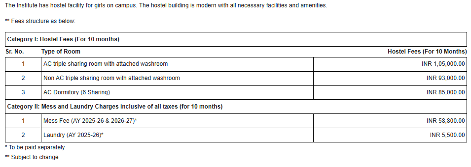 - Mess and laundry charges are payable separately in addition to hostel fees.