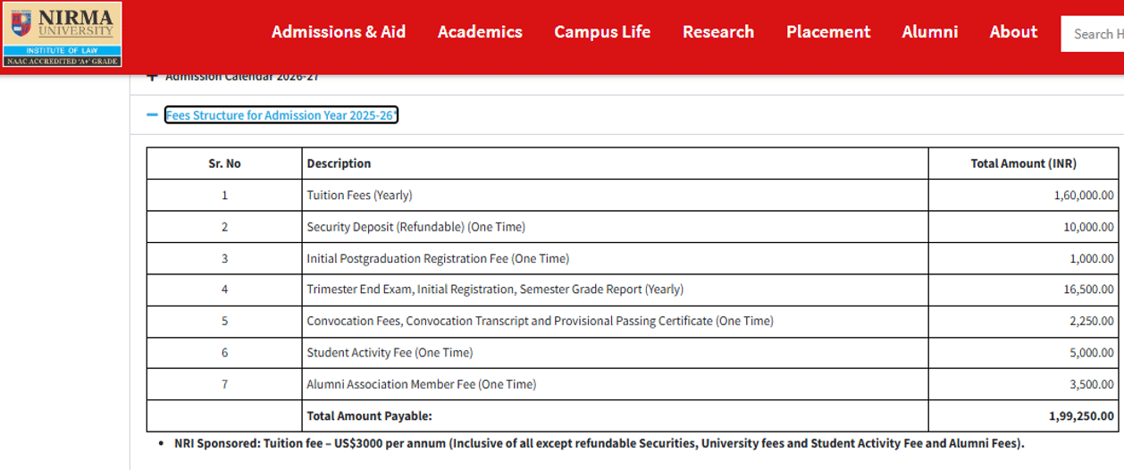 Institute of Law, Nirma University L.L.M Criminal And Security Law fees in first year is ₹ 1.82 Lakhs. The detailed fees is mentioned below.Hostel Fee for Female at Institute of Law, Nirma University is ₹ 85,000 to 1.05 Lakhs.
