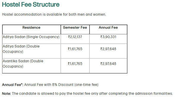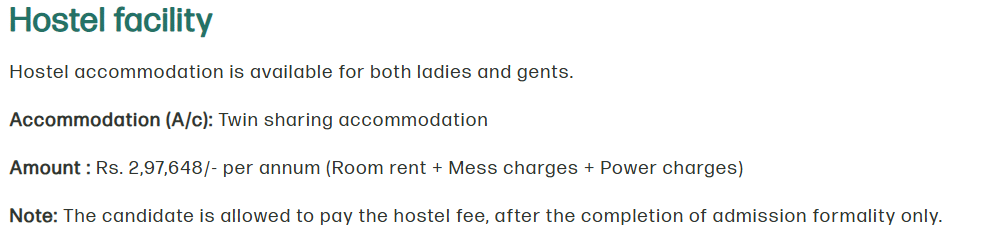 Hostel facility is very good and they are available at 75000 per month which includes our mess fees ehich means food , and a free wifi in every room and the room is given with three students which is far comfortable than the facilities provided by other colleges.