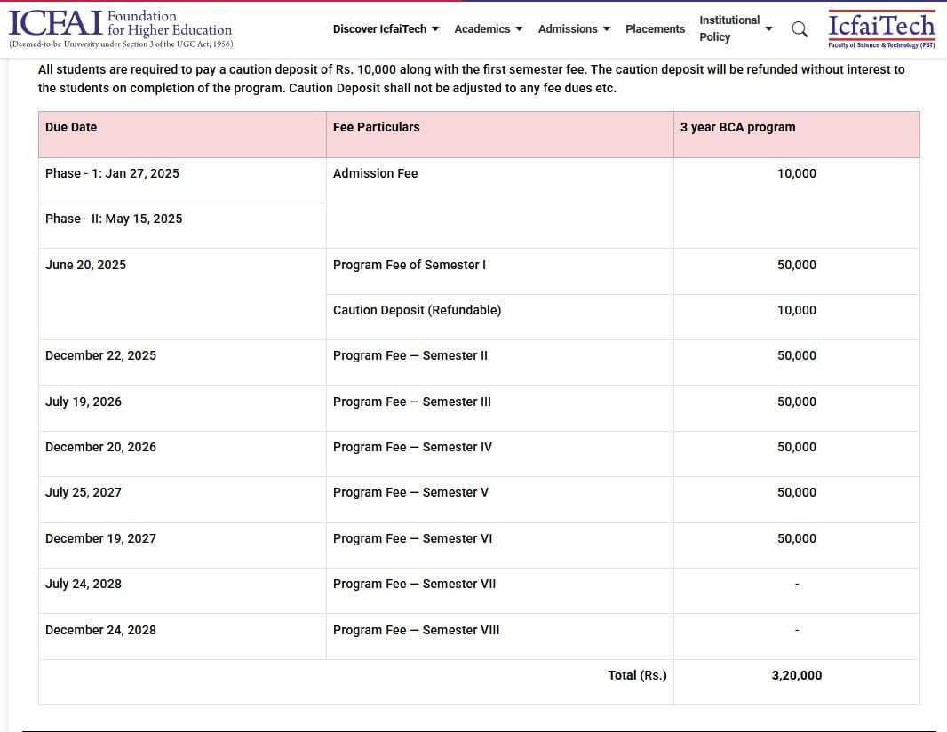 IFHE, Faculty of Science & Technology Hyderabad BCA {Hons.} Artificial Intelligence and Machine Learning fees 2025 is ₹ 3.2 Lakhs for the entire course duration.