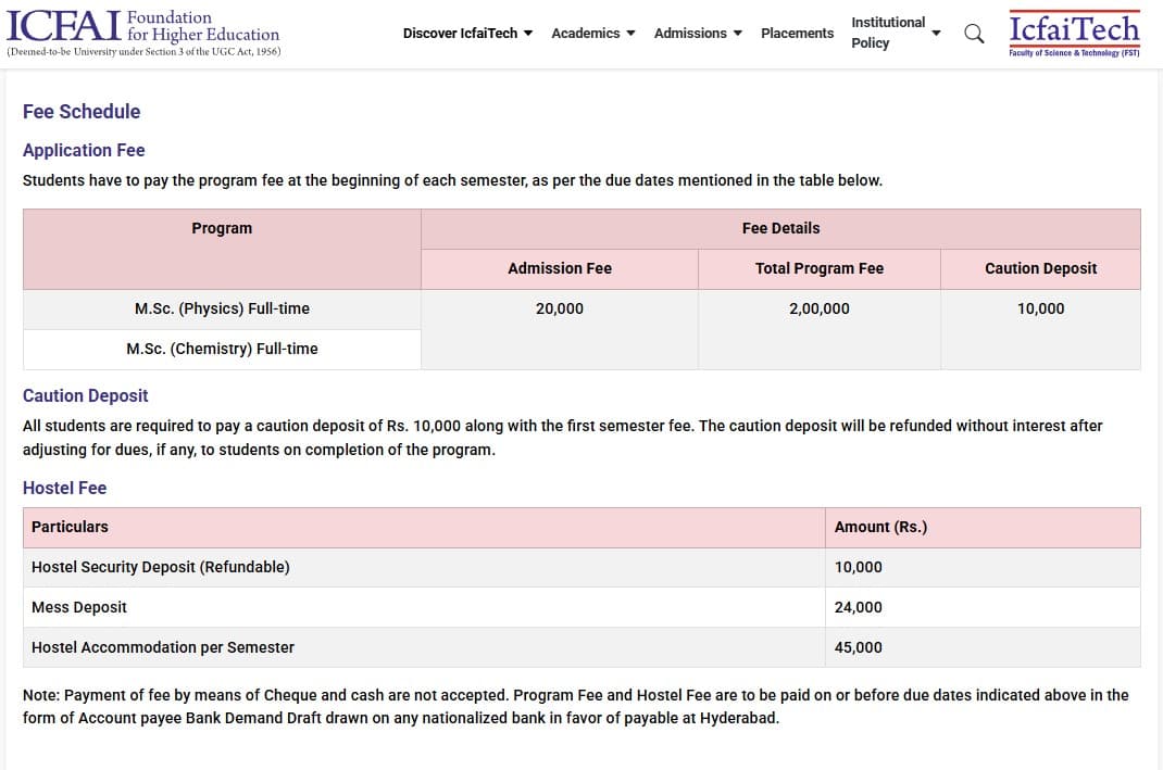 IFHE, Faculty of Science & Technology Hyderabad M.Sc Physics fees 2025 is ₹ 2.3 Lakhs for the entire course duration.