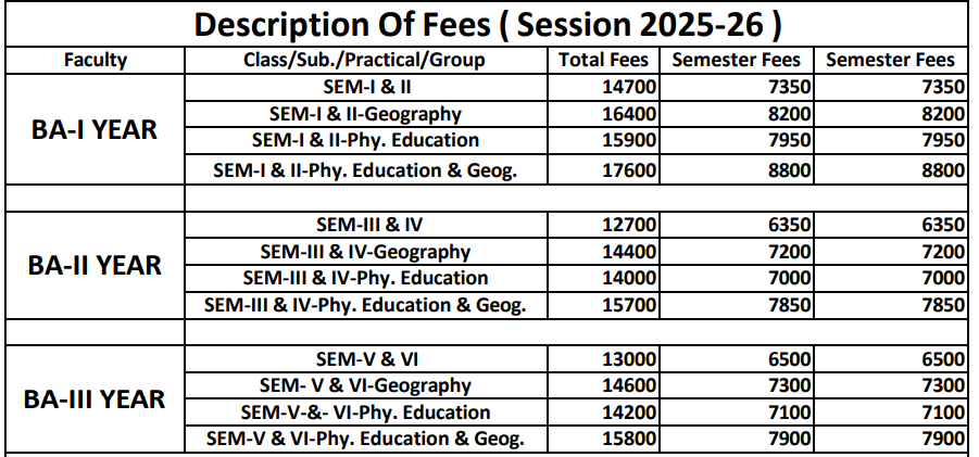 The total cost for the 3-year Bachelor of Arts (BA) degree at Shri Bhawani Niketan PG College is INR 40,400, with candidates required to pay INR 14,700 for the first year, INR 12,700 for the second year, and INR 13,000 for the third year. This undergraduate program offers a comprehensive academic curriculum and is designed to prepare candidates for advanced studies and diverse career opportunities. Seats for admission are allocated in accordance with institutional policies, with reservations available for eligible categories as per government norms. Candidates should note that all fees are subject to change based on university regulations or revisions.