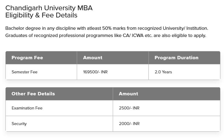 Candidates must have at least Graduation with 50% + CUCET to be eligible for admissions. Check University School of Business, Chandigarh University Admission 2025