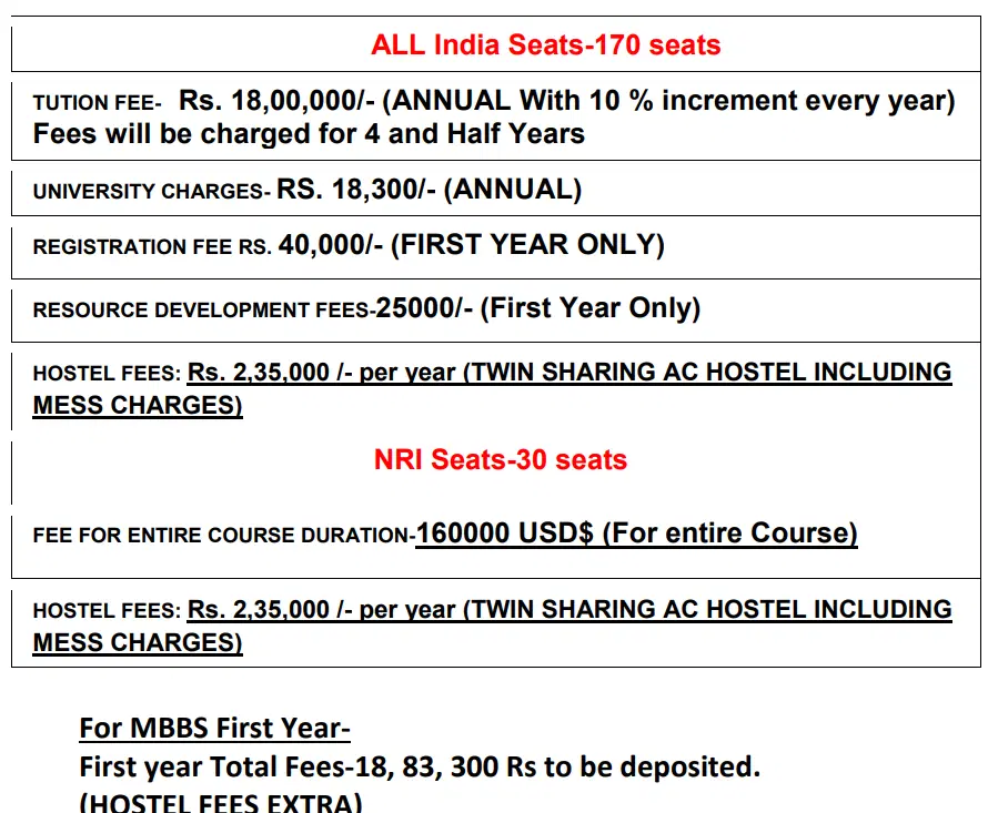 Previously, the fee was about 3.5 lakh INR annually. Scholarships are available for students scoring over 90% in their 12th-grade exams, offering up to a 30% reduction. The first-year fee is 75,000 INR, payable in two installments, and a three-year program costs 2.25 lakh INR. The college's fee structure is high, catering mainly to middle and higher socioeconomic classes. Post-MBBS opportunities include junior resident positions and placements in companies like Vedanta and Apollo, offering packages up to 80 lakh INR per annum.