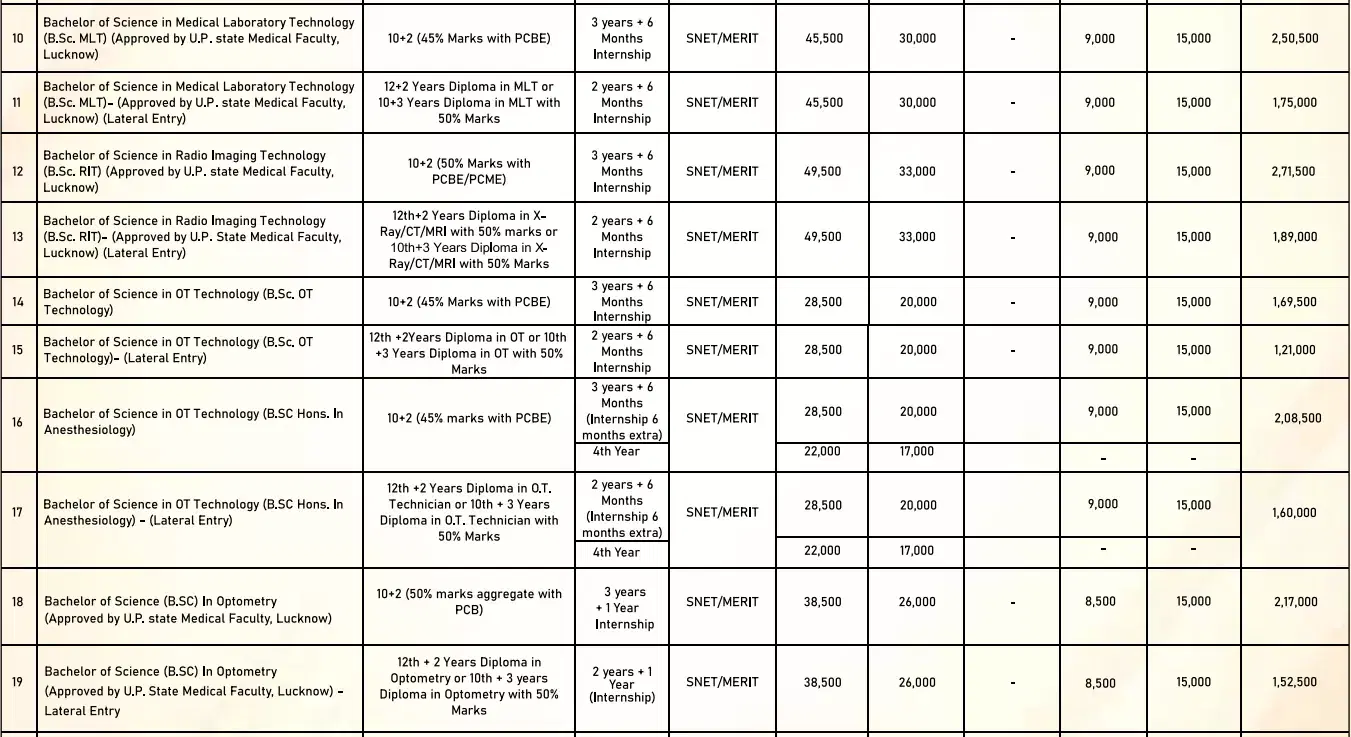 Earlier, B.Sc Operation Theatre Technology fees at Netaji Subhash Chandra Bose Subharti Medical College Meerut was ₹ 1.6 Lakhs (in 2024) for the entire course duration. This shows a fee increase of ₹ 9,500 over the year.