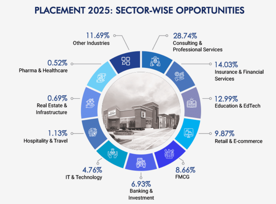 The infographic below displays the sector-wise placements at Globsyn Business School Kolkata. For 2025, the highest recruiting sector was Consulting & Professional Services, followed by Insurance & Financial Services. All other details are displayed in the infographic given below.