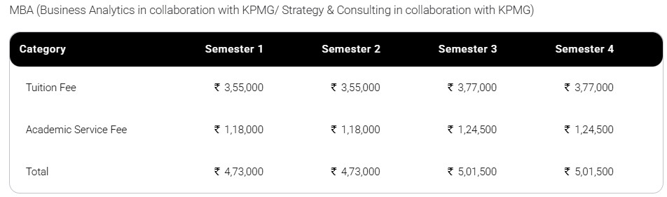 The total cost, including tuition and hostel fees, is up to 22 lakh INR, or 19.5 lakh INR without hostel accommodation. The MBA in Strategy and Consulting or Business Analytics, in collaboration with KPMG, costs about 10 lakh INR annually due to high demand. The core MBA program fees range from 15.5 to 16 lakh INR, with specialized MBAs in fields like Aviation and International Business priced around 17 lakh INR.