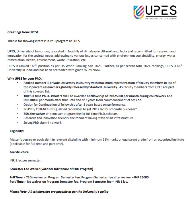 25 Nov, 2025 UPES School of Business PhD Admission 2025 is open. The last date to apply @www.upes.ac.in is Dec 4, 2025. Register Now!