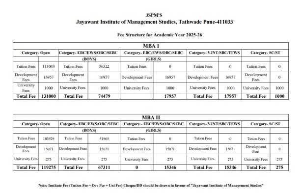 Earlier, MBA fees at Jayawant Institute of Management Studies Tathawade was ₹ 2.12 Lakhs (in 2023) for the entire course duration. This shows a fee increase of ₹ 38,275 over the year.