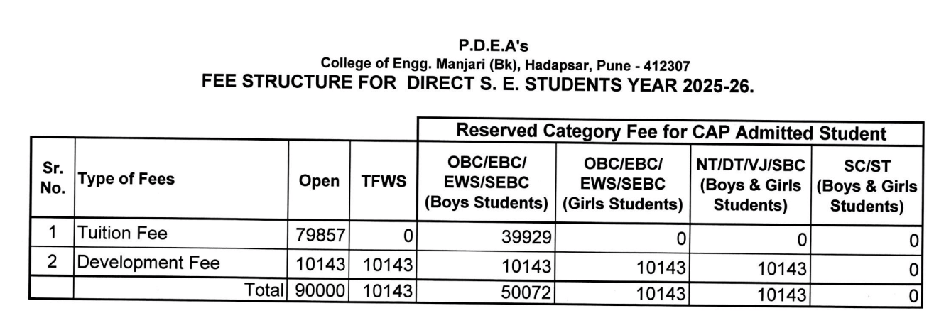 PDEA College of Engineering Manjari Pune BE {Lateral} Information Technology fees in first year is ₹ 90,000. The detailed fees is mentioned below.Hostel Fee for Female at PDEA College of Engineering Manjari Pune is ₹ 24,000 to 55,000.