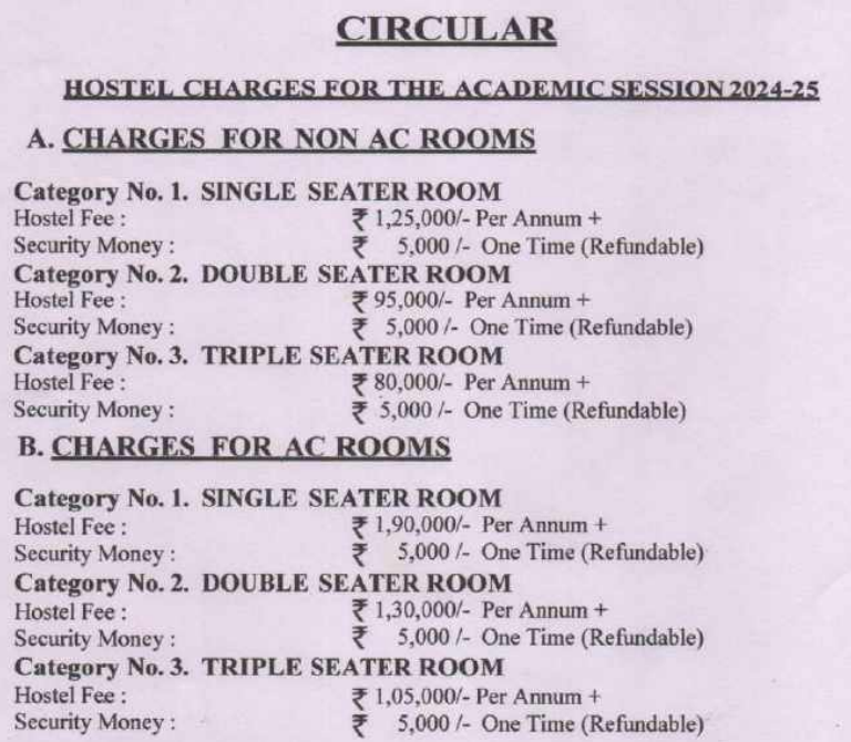The registration process is very easy for the hostel and for a single seater room the price is 125000 and for a double seater it is 95000 and for a triple 85000 there are ac rooms also available and the prices are for a single ac room 190000 for a double ac room 130000
