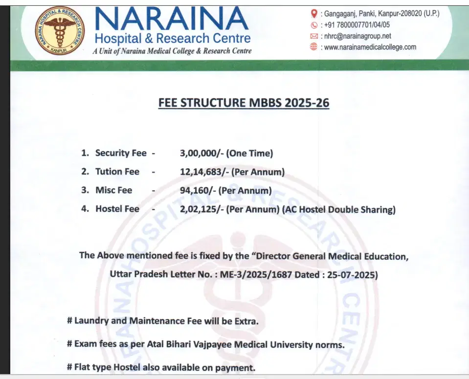 Naraina Medical College & Research Center Kanpur MBBS fees in first year is ₹ 16.09 Lakhs. The detailed fees is mentioned below.Naraina Medical College & Research Center Kanpur Hostel Fee is ₹ 2.02 Lakhs.