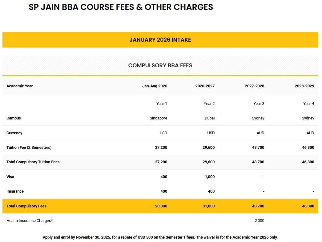 A distinctive feature of this program is the tri-city model, which provides international exposure to students and prepares them for leadership positions. Assessments are crafted to test both theoretical understanding and practical application. The total tuition fee for the four-year course is 84 Lacs, along with an additional registration fee of 2 Lacs to secure admission. The program offers merit-based scholarships, though these come with specific conditions for their retention.