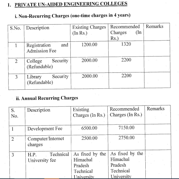 The B.Tech program at KC Institute of Engineering & Technology, Una costs INR 49,000 per year as tuition fee. At admission, students also pay a one-time charge of INR 5,720 towards admission and refundable security deposits. Annual recurring fees include INR 7,150 for development and INR 2,750 for internet, plus the Himachal Pradesh Technical University fee as fixed. Overall, the first-year cost is about INR 64,620, and subsequent years are about INR 58,900 each, excluding university charges.