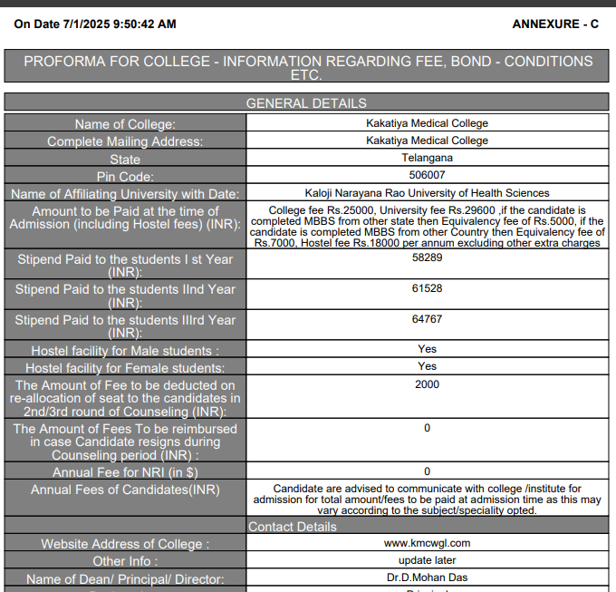 KMC Warangal M.S General Surgery fees in first year is ₹ 54,600. The detailed fees is mentioned below.KMC Warangal Hostel Fee is ₹ 18,200.