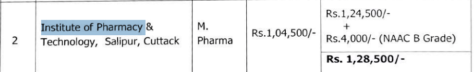 Institute of Pharmacy and Technology Cuttack M.Pharm Pharmaceutical Chemistry Fee has not been released yet. For reference you can check the previous year academic fees in the section below.