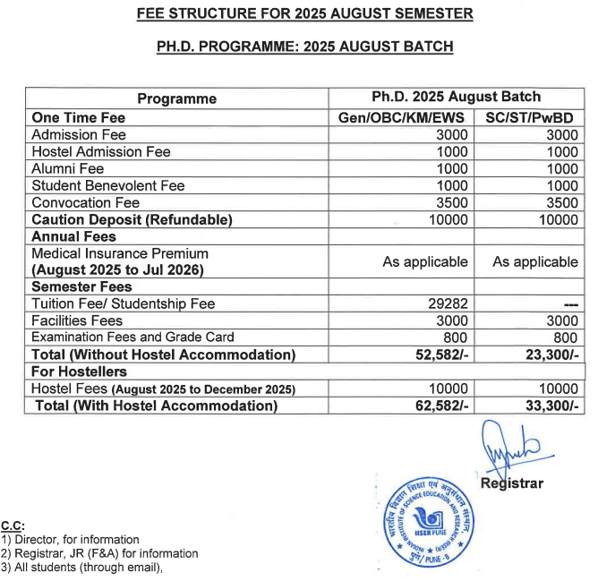 Earlier, Ph.D Biology fees at IISER Pune was ₹ 5.68 Lakhs (in 2024) for the entire course duration. This shows a fee decrease of ₹ 2.33 Lakhs over the year.