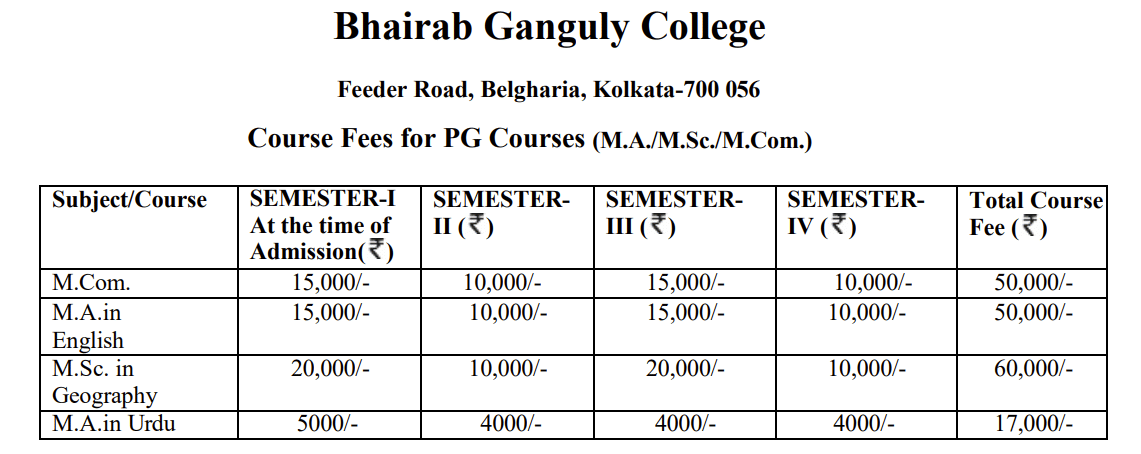 Earlier, M.Sc Geography fees at Bhairab Ganguly College Kolkata was ₹ 60,000 (in 2024) for the entire course duration. This shows a fee decrease of ₹ 10,000 over the year.