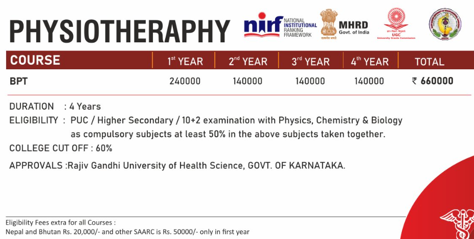 The minimum eligibility for admission to B.P.T at RRGOI is 10+2 with 50%. Candidates are allotted seats based on KCET.