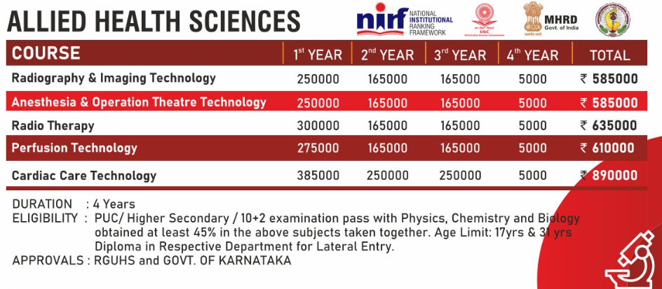 The minimum eligibility for admission to B.Sc Radiotherapy at RRGOI is 10+2 with 45%.