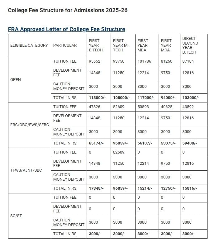 SVERI College provides a challenging course structure with a strong support system from faculty members. The college caters to students from different castes with varied fee structures, such as a fee of 3,000 for CS ST students. The annual fees are set at 10,000, with additional semester fees of 2,000, registration fees of 1,000, lab fees of 2,000, and development fees of 2,000. SBC caste students can benefit from a semester-wise scholarship of 3,015.