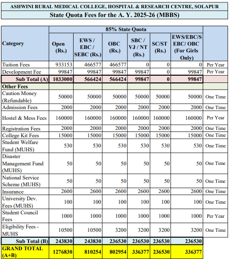 Admission to the MBBS program at Ashwini Rural Medical College in Solapur, Maharashtra, is based on NEET scores. The college offers 100 seats, and applicants must have completed their 12th grade in the science stream. Admission is determined by state merit and college preferences. The college provides a strong infrastructure, including hostel facilities and an on-site hospital for practical training. The faculty comprises about 80 qualified doctors offering clinical postings and practical sessions.