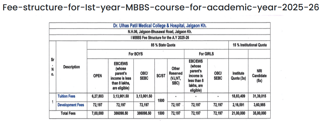 Dr. Ulhas Patil Medical College & Hospital Jalgaon MBBS fees in first year is ₹ 7 Lakhs. The detailed fees is mentioned below.Dr. Ulhas Patil Medical College & Hospital Jalgaon Hostel Fee is ₹ 1 Lakh.