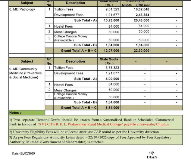 BKL Walawalkar Rural Medical College Ratnagiri M.D Anesthesiology fees in first year is ₹ 10.23 Lakhs. The detailed fees is mentioned below.BKL Walawalkar Rural Medical College Ratnagiri Hostel Fee is ₹ 1.84 Lakhs.