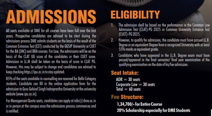 Delhi Metropolitan Education Noida offers a total of 30 seats for L.L.M Corporate Law. Candidates must have at least Graduation with 55% CLAT to be eligible for admissions. Admissions are offered based on IPU-CET. Check Delhi Metropolitan Education Noida Admission 2025