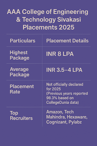 The college provides diverse placement opportunities with eligibility starting from the 6th or 7th semester. Approximately 90-100% of students secure placements, with top recruiters including Zoho, Infosys, TCS, Renault Nissan, Accenture, and HCL. The highest salary package offered is 5 lakhs per annum, while the average package is around 3-4 lakhs per annum.