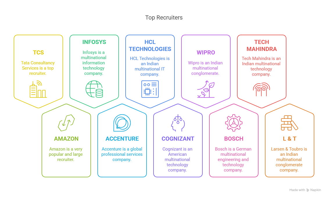 The placement scenario at the college shows a mixed performance. Notable companies such as TCS, Wipro, Tech Mahindra, Infosys, and Reliance Jio visit for campus placements. The placement rate ranges between 50% to 95%, with the highest package reaching 12 lakh per annum and the average package around 3 lakh per annum.