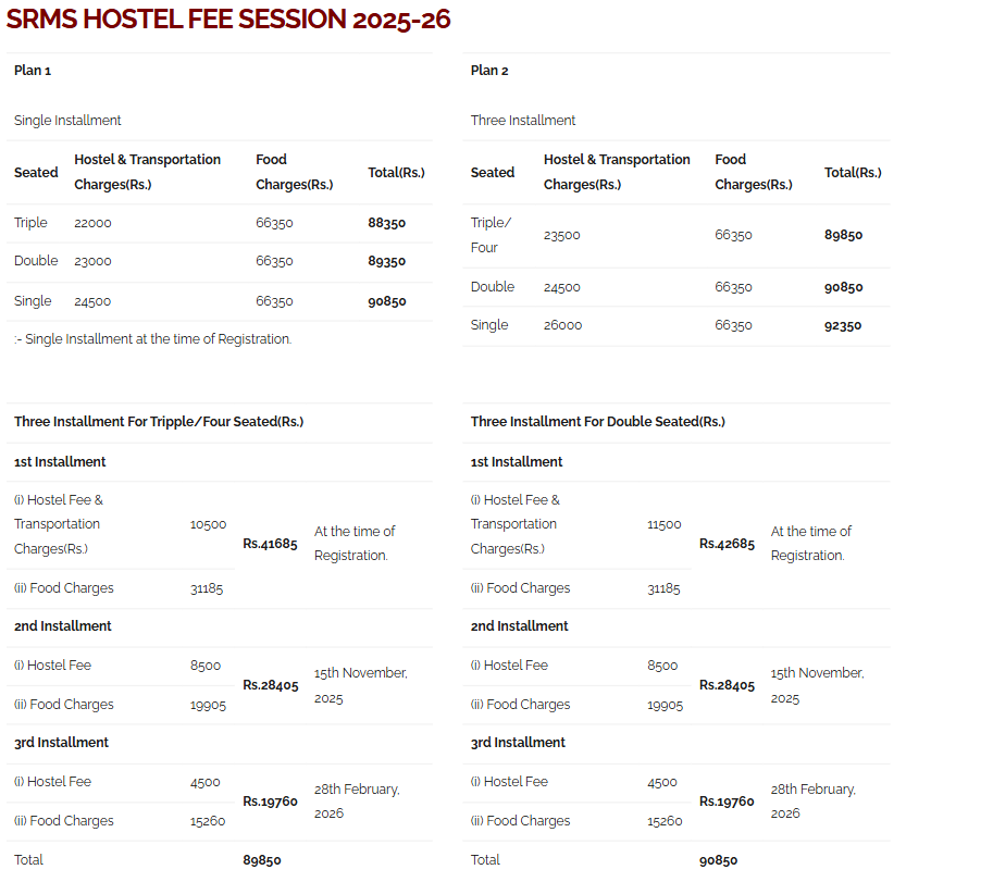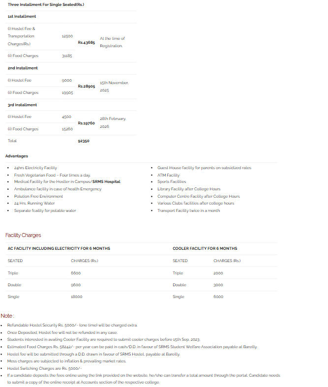 The college offers four hostels with separate accommodations for boys and girls, providing single, double, and triple sharing options. The total cost, inclusive of mess fees and other security expenses, was approximately 65,000 INR annually in 2012. Hostels feature 4x4 rooms shared by three students, each equipped with a bed, study table, chair, and personal Almira.