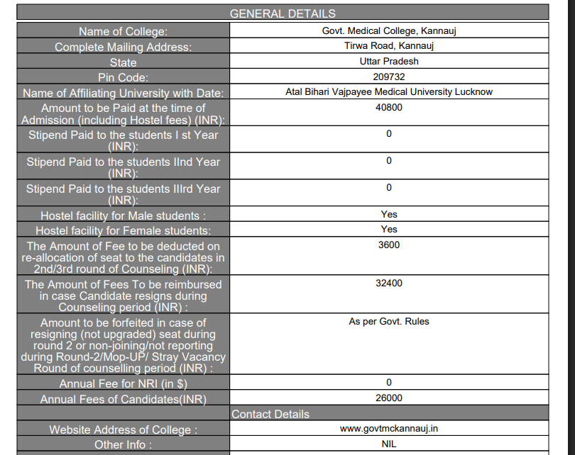 Ans. The annual tuition fee at GMC Kannauj is Rs. 40,800. In addition, a one-time refundable security deposit of Rs. 10,000 and miscellaneous charges of approximately Rs. 10,000 per year are applicable. Hostel fee is Rs. 5,000 per year (optional), and mess charges are approximately Rs. 3,000 per month. There are no management or NRI quota seats, so all students pay the same government fee. The total approximate first-year cost including hostel is around Rs. 65,800.