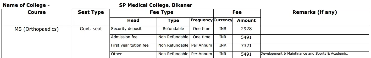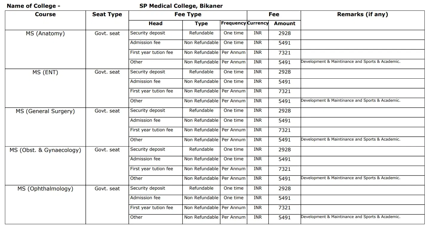 SPMC Bikaner M.S General Surgery is offered as 3 Years Full Time program, with total intake of 11 seats. The minimum eligibility criteria for M.S is MBBS + NEET PG. The total fees for SPMC Bikaner M.S General Surgery in 2025 is ₹ 46,855 for the complete course duration, which includes total tuition fees of ₹ 21,963. Earlier, the fees in 2016 - 2017 for M.S General Surgery was ₹ 11,235.