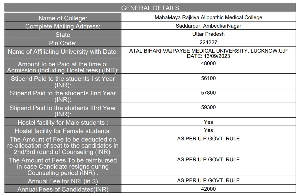 Mahamaya Rajkiya Allopathic Medical College Ambedkar Nagar Hostel Fee is ₹ 4,800 to 6,000.