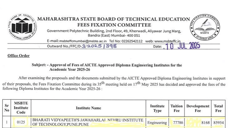 Bharati Vidyapeeth Jawaharlal Nehru Institute of Technology Pune Polytechnic Civil Engineering Fee has not been released yet. For reference you can check the previous year academic fees in the section below.