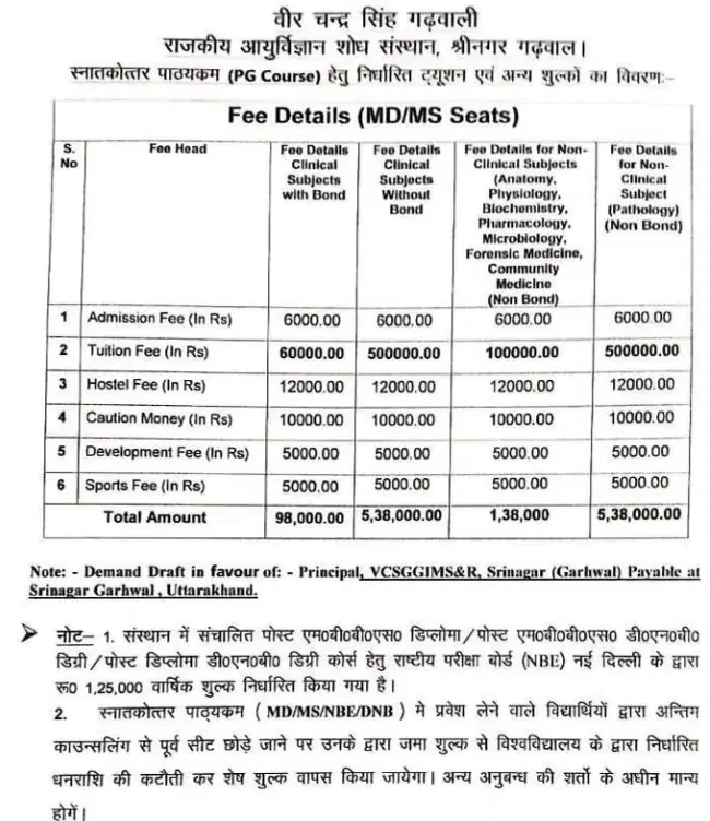Veer Chandra Singh Garhwali Government Institute Of Medical Science and Research Srinagar Hostel Fee is ₹ 6,000 to 12,000.