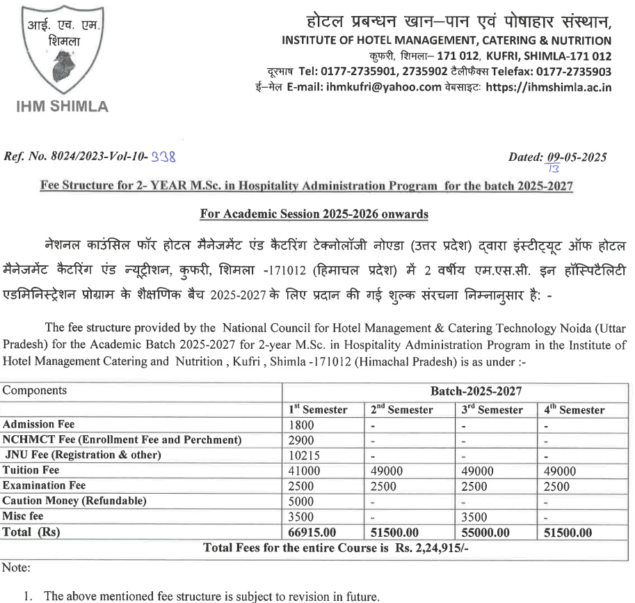 Earlier, M.Sc(HA) Hospitality Administration fees at Institute of Hotel Management Catering and Nutrition Shimla was ₹ 2.25 Lakhs (in 2024) for the entire course duration. This shows a fee decrease of ₹ 2,900 over the year.