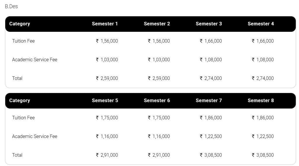 | Semester Wise Fees | ₹259000 | ₹259000 | ₹274000 | ₹274000 | ₹291000 | ₹291000 | ₹308500 | ₹308500 |