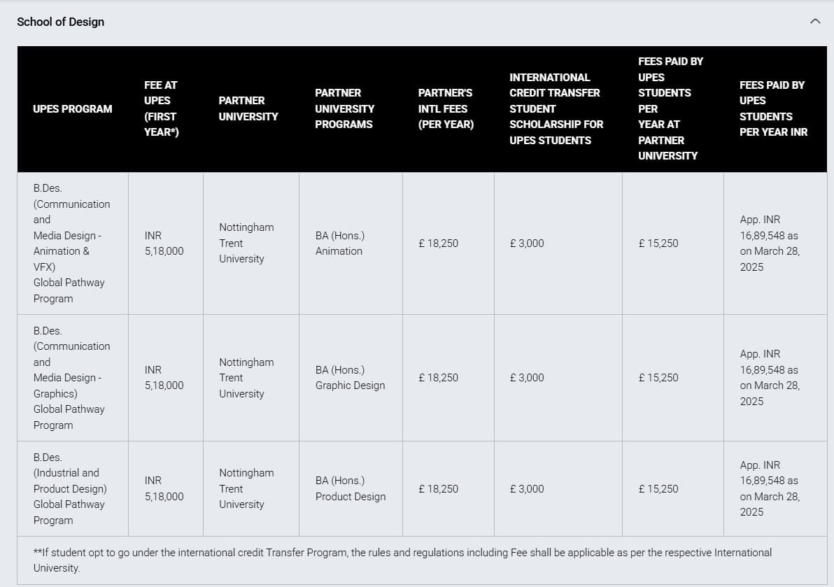 UPES, School of Design Studies Dehradun B.Des is offered as 4 Years Full Time program. The minimum eligibility criteria for B.Des is 10+2 with 50% + UPESDAT. The total fees for UPES, School of Design Studies Dehradun B.Des in 2025 is ₹ 22.65 Lakhs for the complete course duration, which includes total tuition fees of ₹ 13.66 Lakhs. Earlier, the fees in 2024 - 2025 for B.Des was ₹ 21.58 Lakhs.